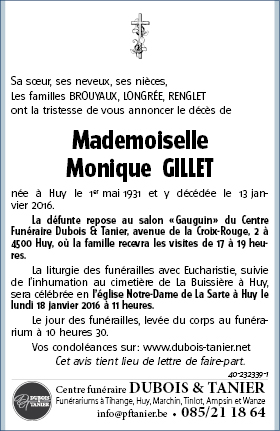 Fallecida en Huy (4500) el miércoles, 13 de enero de 2016 a la edad de 84 años