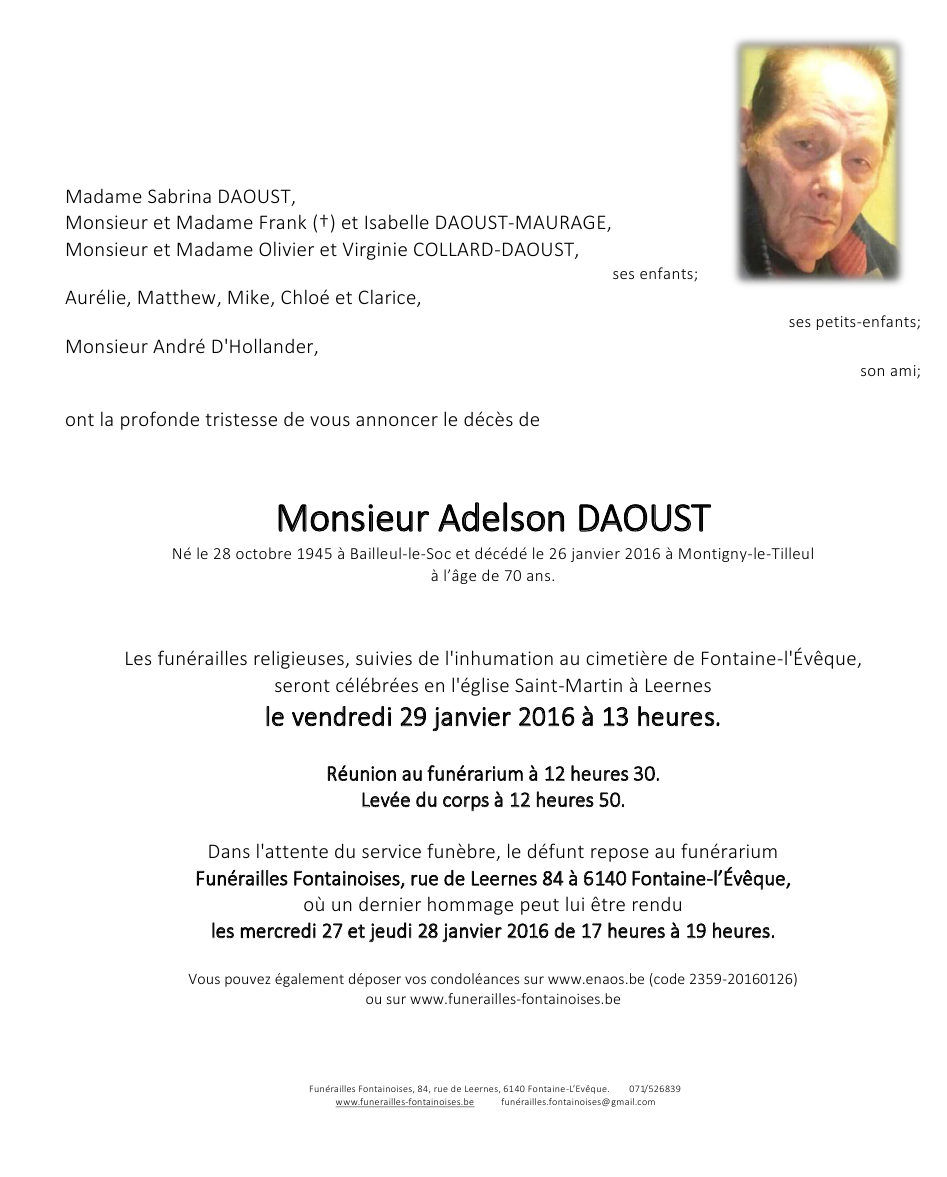 Overleden te Montigny-le-Tilleul (6110) op dinsdag 26 januari 2016 op 70-jarige leeftijd