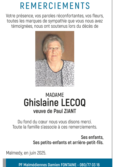 Décédée à Malmedy (4960) le jeudi 19 juin 2025 à l'âge de 86 ans