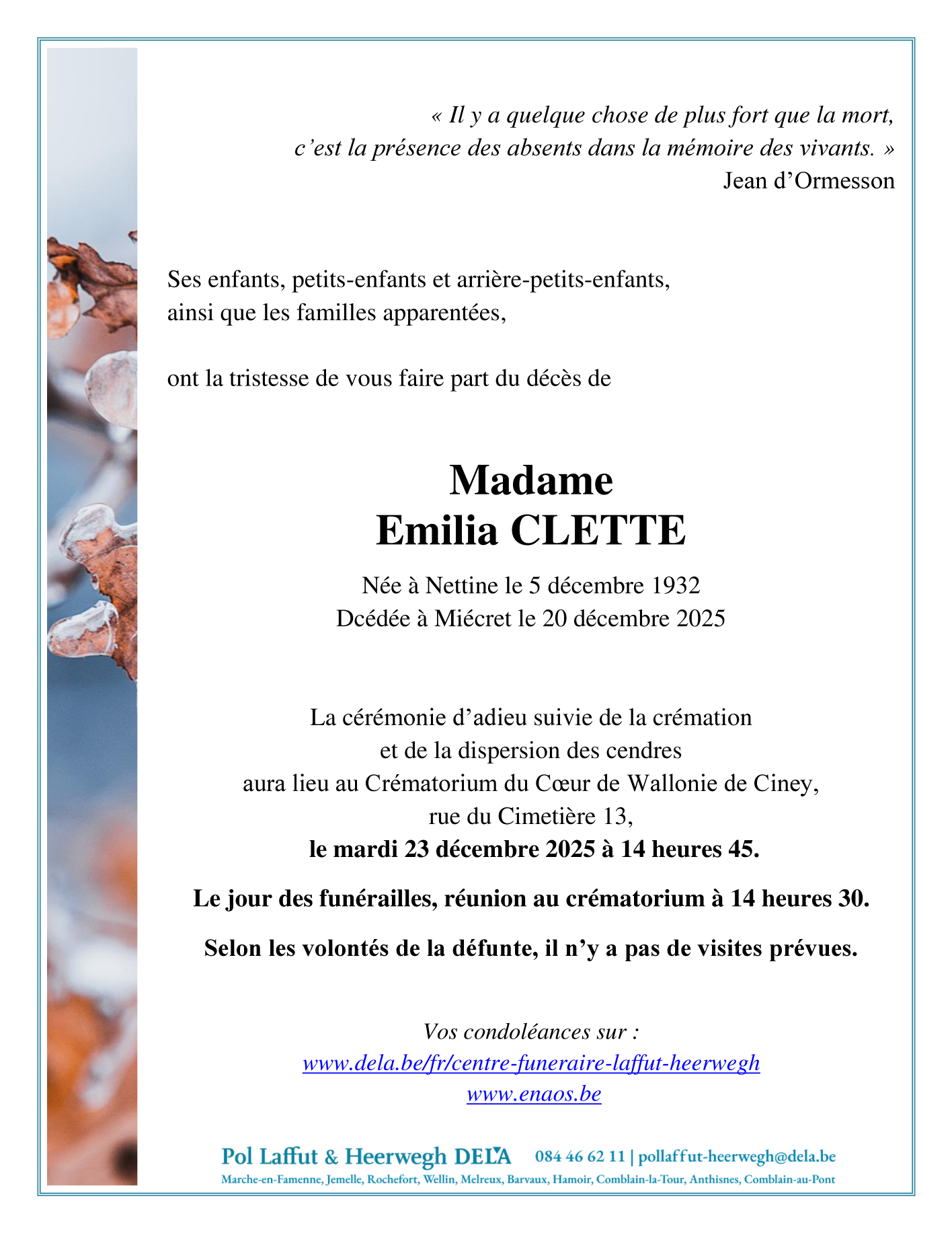 Décédée à Miécret (5376) le samedi 20 décembre 2025 à l'âge de 93 ans