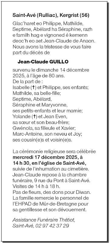 Overleden te Mur de Bretagne (22530, Frankrijk) op zondag 14 december 2025 op 80-jarige leeftijd