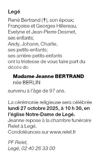 Décédée à Legé (44650, France) le jeudi 23 octobre 2025 à l'âge de 97 ans
