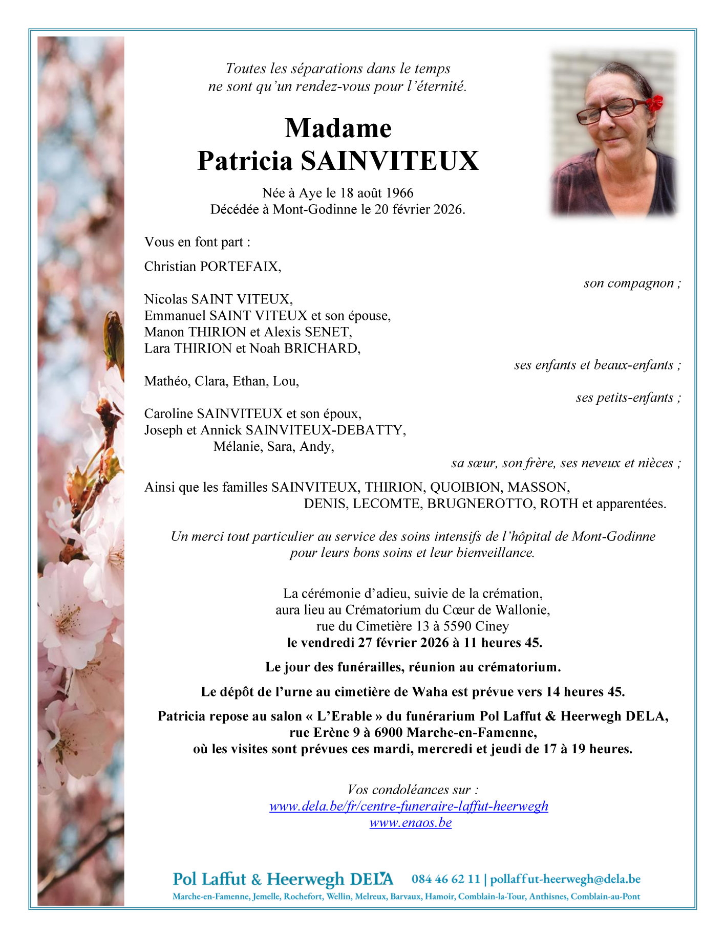Décédée à Mont-Godinne (5530) le vendredi 20 février 2026 à l'âge de 59 ans