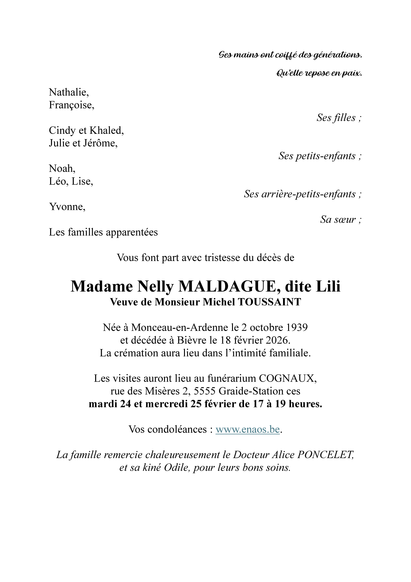 Décédée à Bievre (5555) le mercredi 18 février 2026 à l'âge de 86 ans