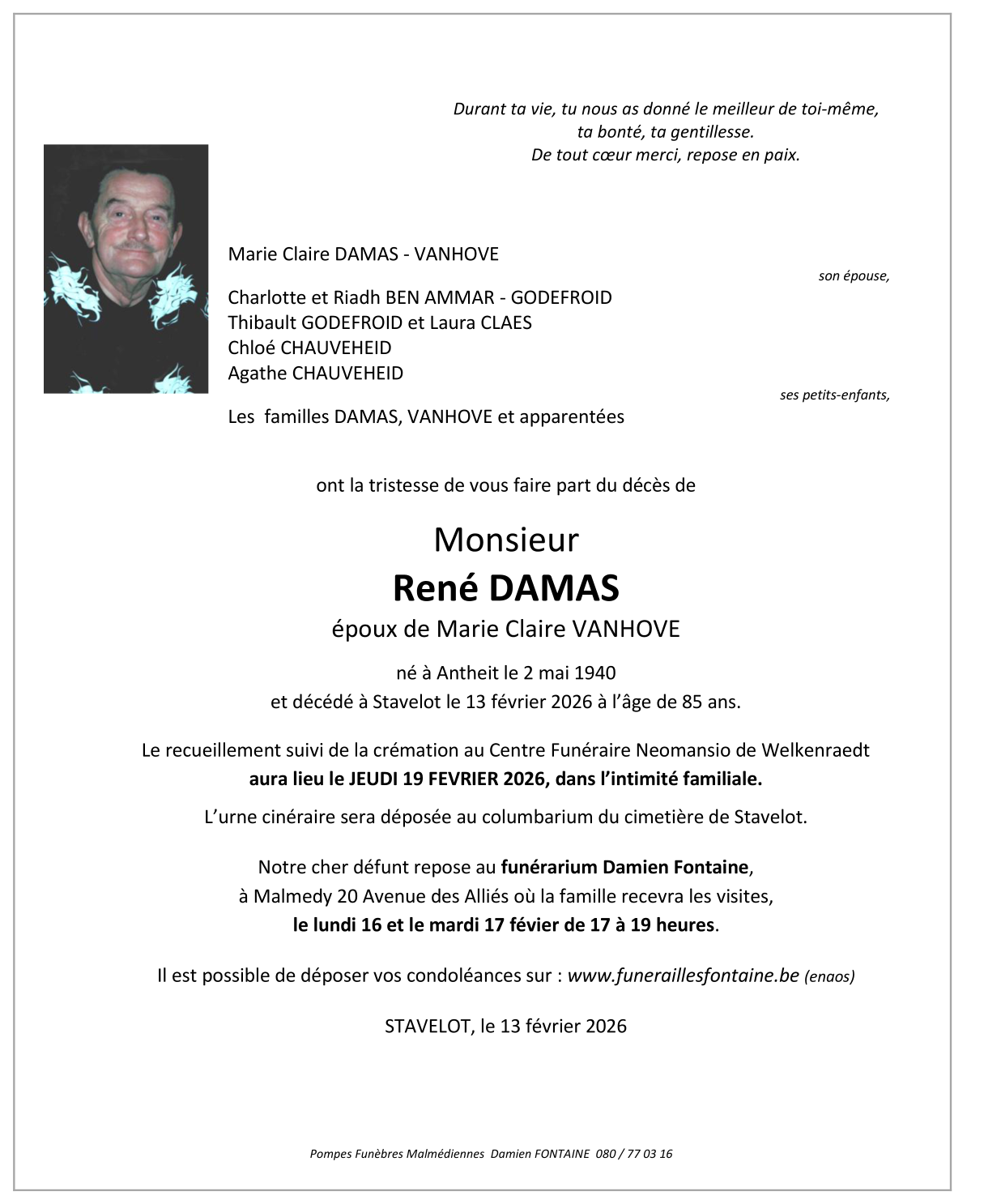 Overleden te Stavelot (4970) op vrijdag 13 februari 2026 op 85-jarige leeftijd