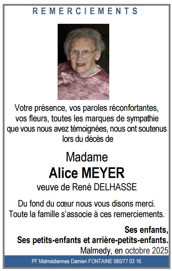 Décédée à Malmedy (4960) le jeudi 16 octobre 2025 à l'âge de 97 ans