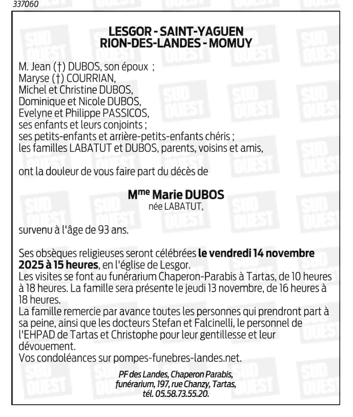 Died in Tartas (40400, France) on 10 November 2025 at the age of 93 years