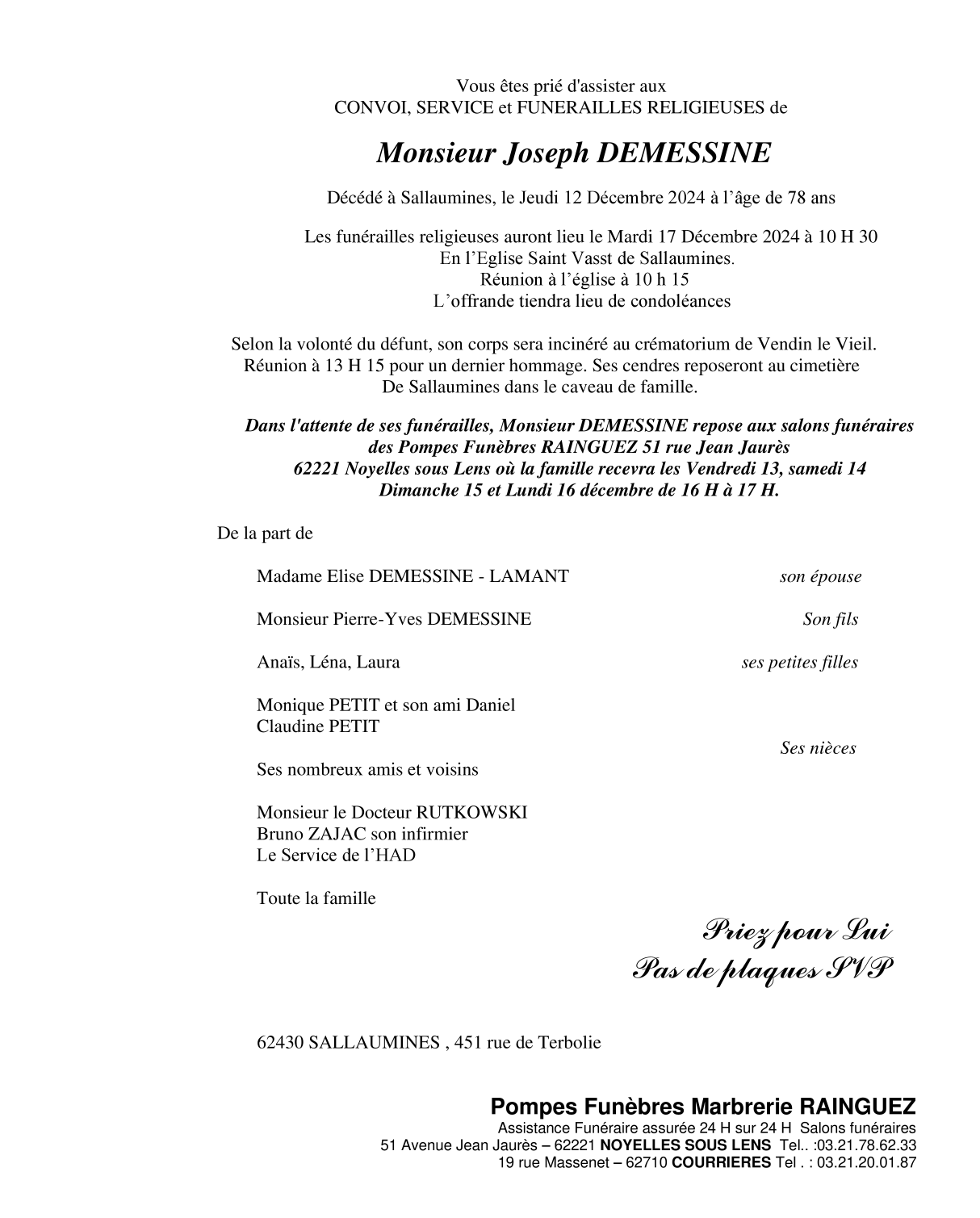 Décédé à Sallaumines (62430, France) le jeudi 12 décembre 2024 à l'âge de 78 ans