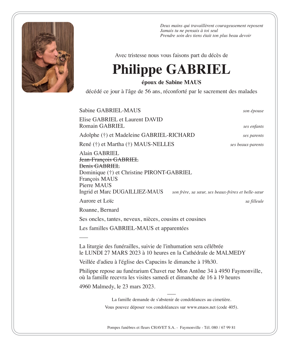 Décédé à Malmedy (4960) le jeudi 23 mars 2023 à l'âge de 56 ans