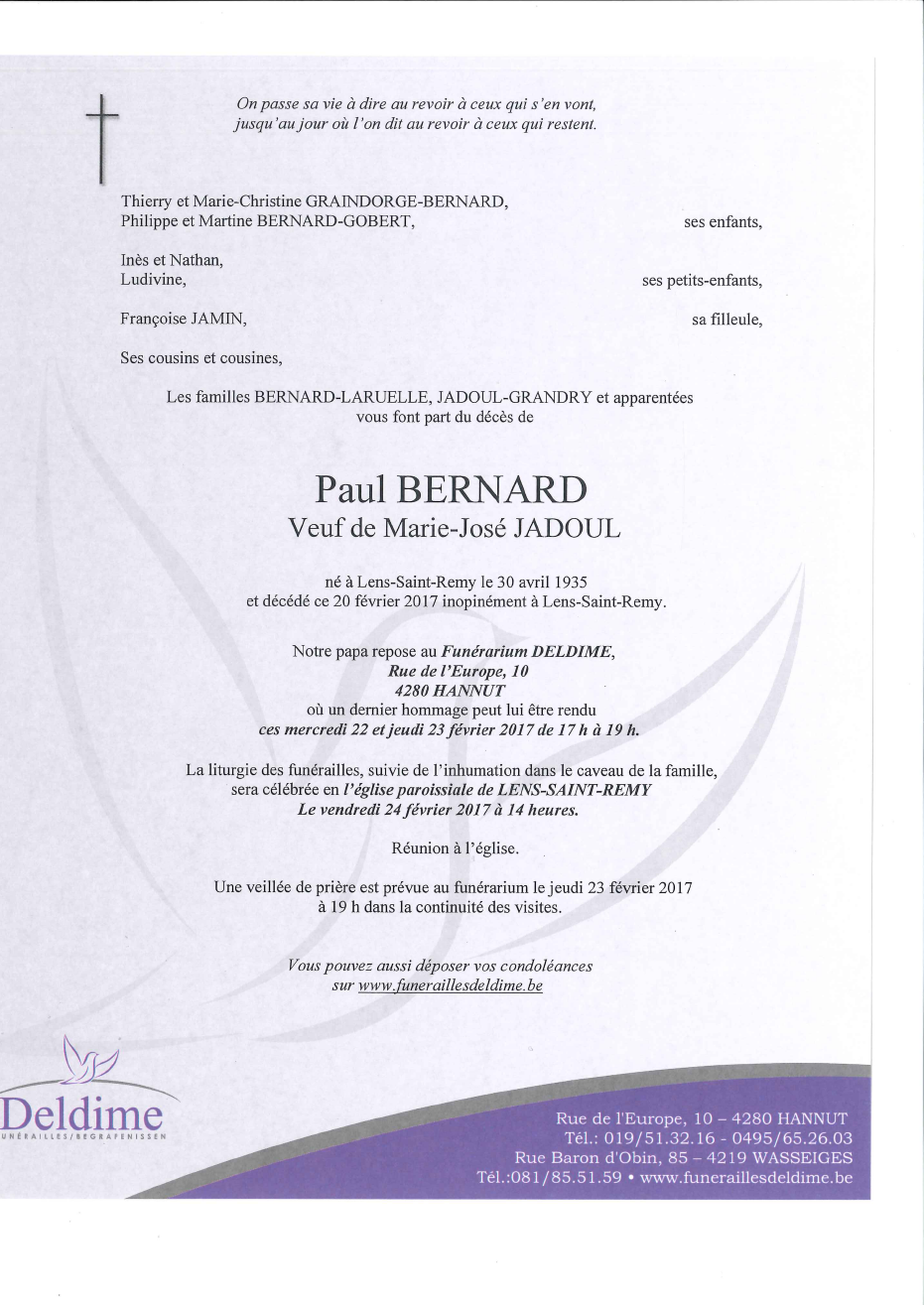 Died in Lens-Saint-Remy (4280) on 20 February 2017 at the age of 81 years