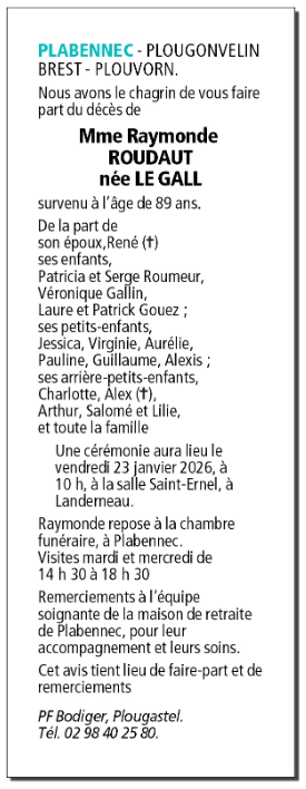 Décédée à Plabennec (29860, France) le dimanche 18 janvier 2026 à l'âge de 89 ans