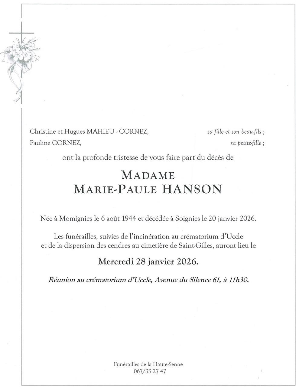Décédée à Soignies (7060) le mardi 20 janvier 2026 à l'âge de 81 ans