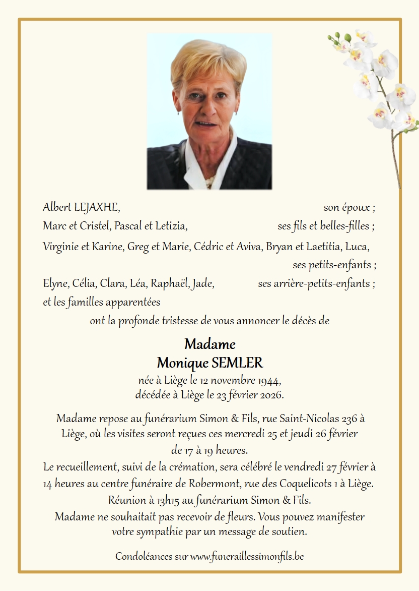 Décédée à Liège (4000) le lundi 23 février 2026 à l'âge de 81 ans