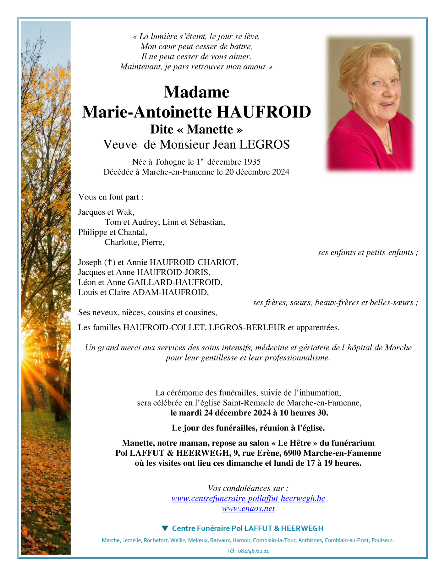 Décédée à Marche-en-Famenne (6900) le vendredi 20 décembre 2024 à l'âge de 89 ans