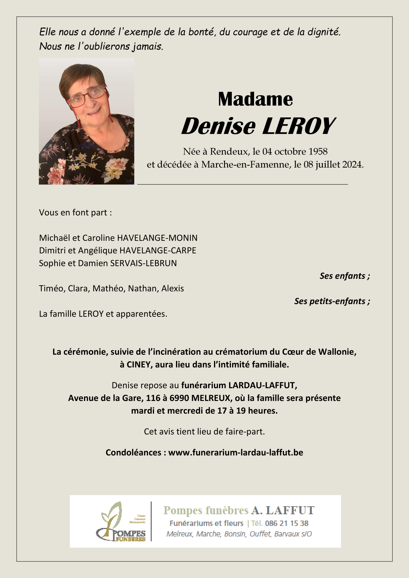 Fallecida en Marche-en-Famenne (6900) el lunes, 8 de julio de 2024 a la edad de 65 años