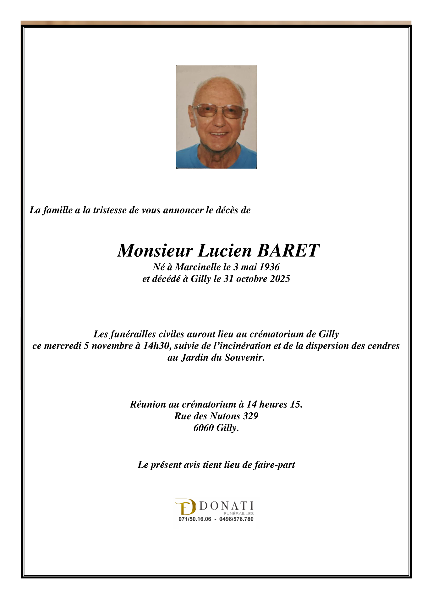 Died in Gilly (6060) on 31 October 2025 at the age of 89 years