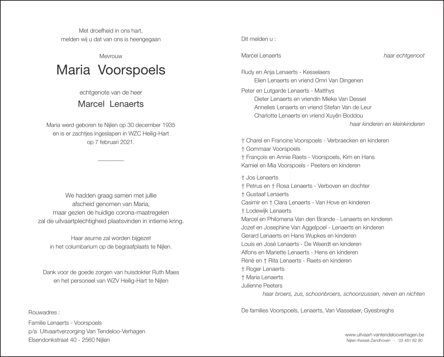 Overleden te Nijlen (2560) op zondag 7 februari 2021 op 85-jarige leeftijd