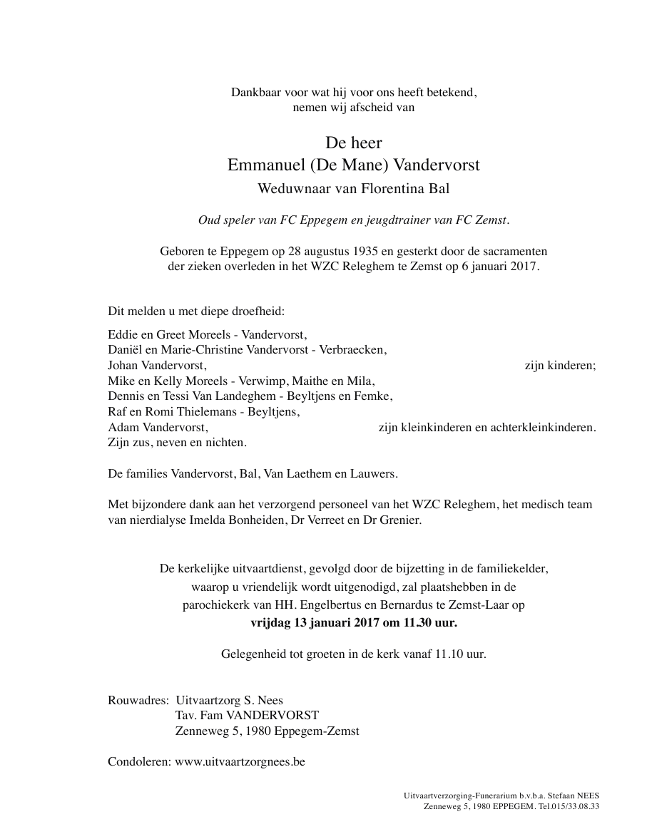 Décédé à Zemst (1980) le vendredi 6 janvier 2017 à l'âge de 81 ans
