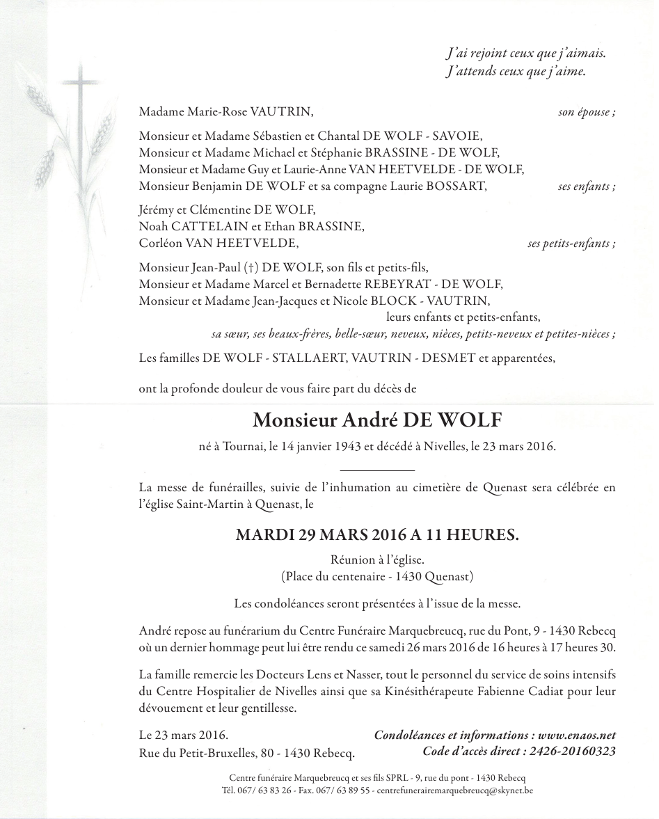 Décédé à Nivelles (1400) le mercredi 23 mars 2016 à l'âge de 73 ans