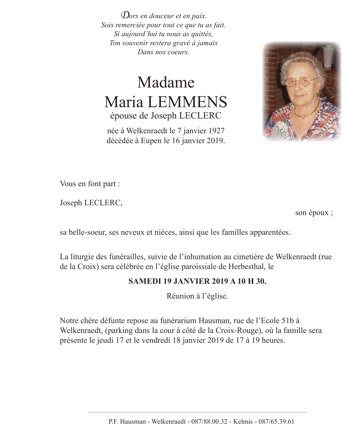 Décédée à Eupen (4700) le mercredi 16 janvier 2019 à l'âge de 92 ans