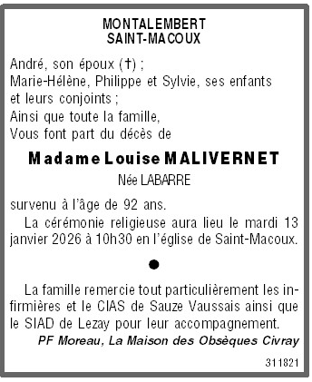 Overleden te Montalembert (79190, Frankrijk) op dinsdag 6 januari 2026 op 92-jarige leeftijd