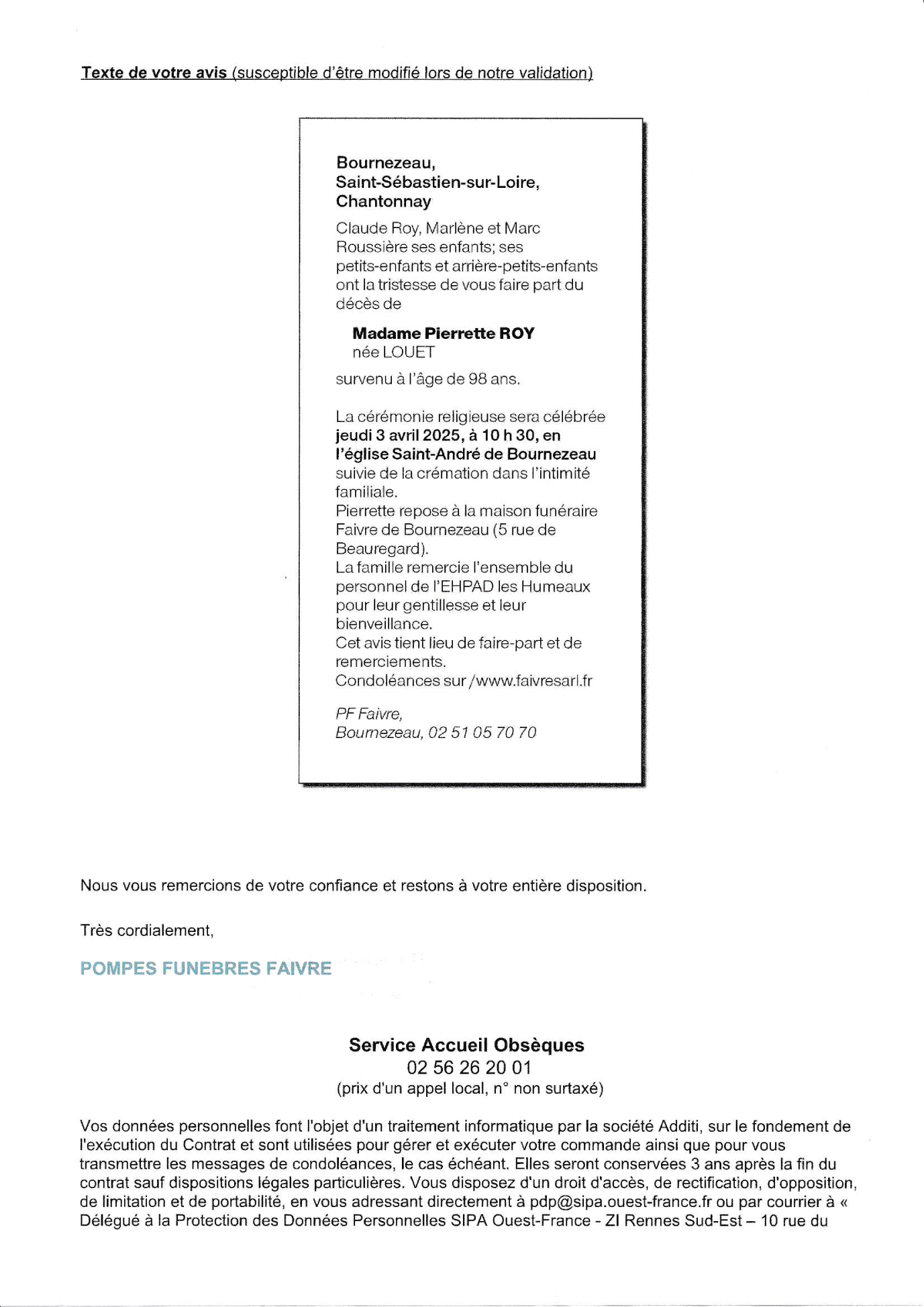 Décédée à Bournezeau (85480, France) le lundi 31 mars 2025 à l'âge de 98 ans
