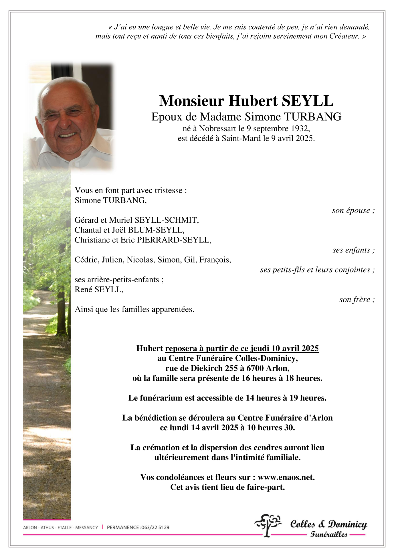Né à Nobressart (6717) le vendredi 9 septembre 1932