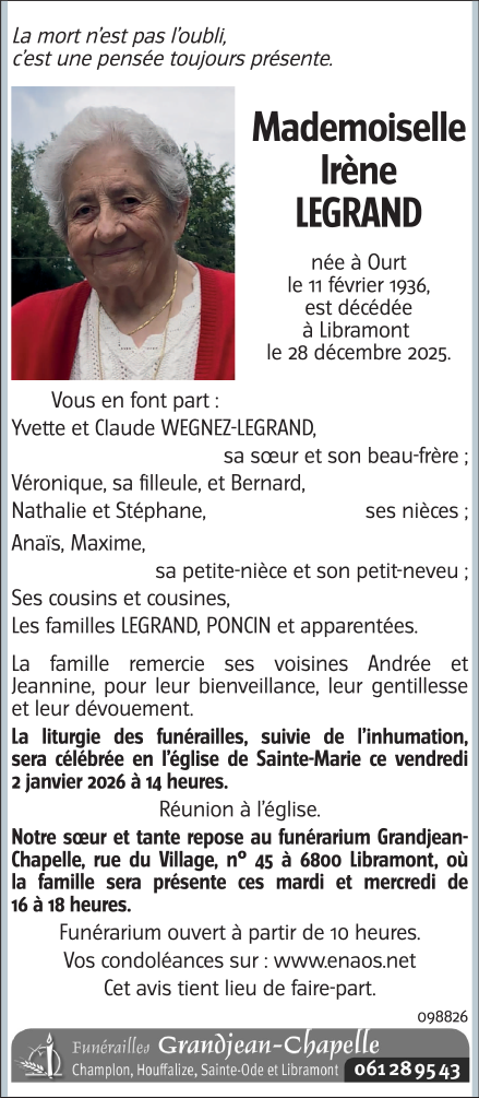 Died in Libramont (6800) on 28 December 2025 at the age of 89 years