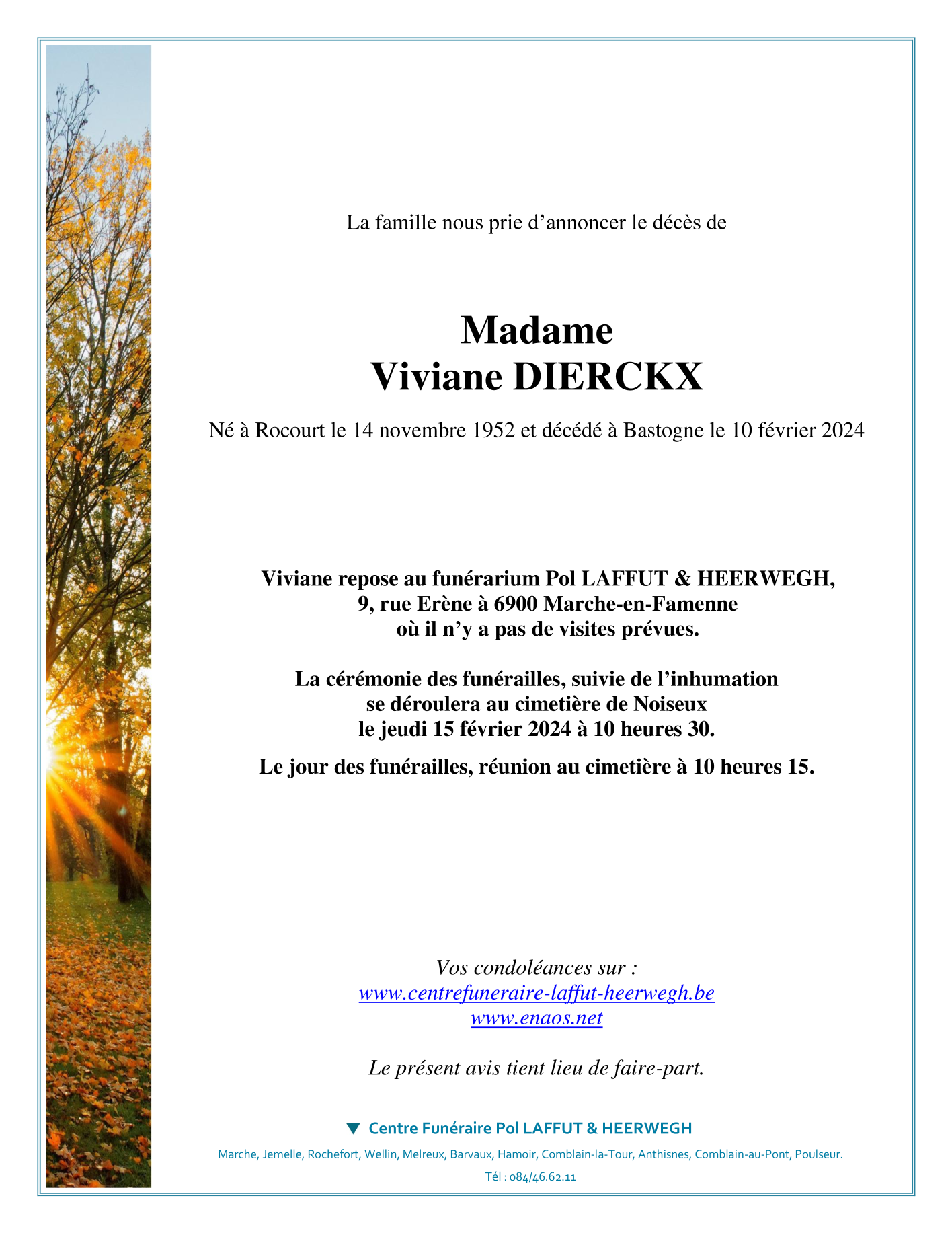 Fallecida en Bastogne (6600) el sábado, 10 de febrero de 2024 a la edad de 71 años