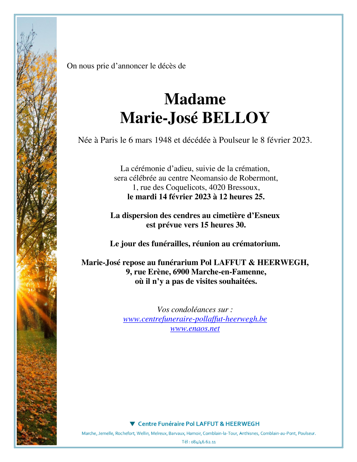 Décédée à Poulseur (4171) le mercredi 8 février 2023 à l'âge de 74 ans