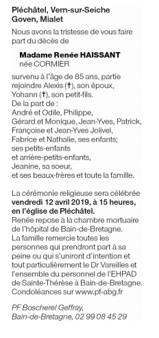 Died in Bain-de-Bretagne (35470, France) on 09 April 2019 at the age of 85 years