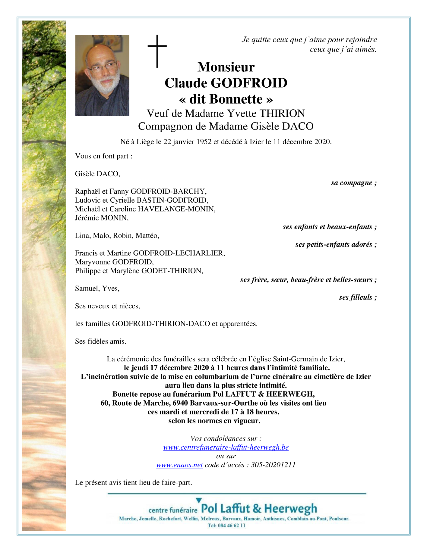 Décédé à Izier (6941) le vendredi 11 décembre 2020 à l'âge de 68 ans