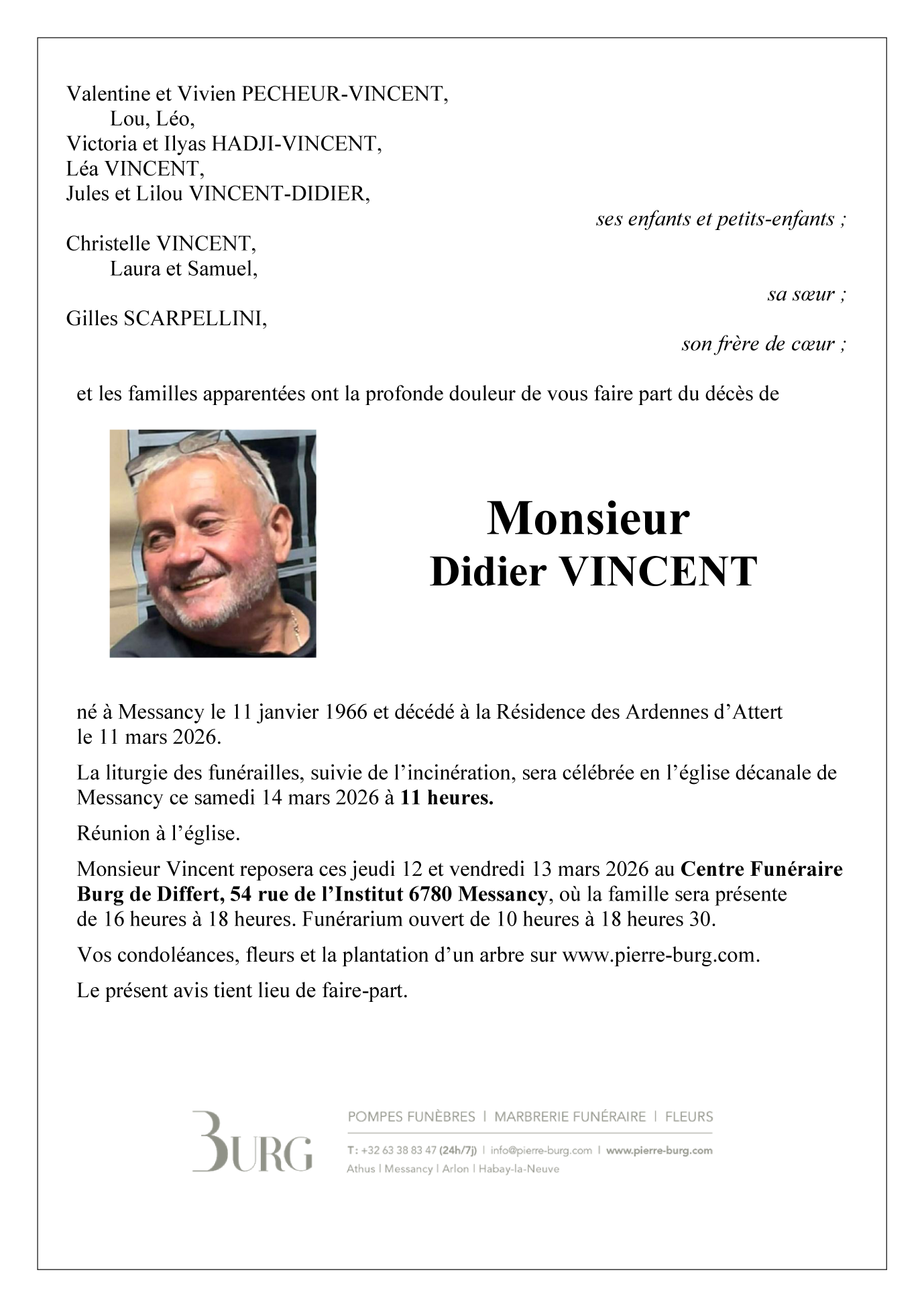 Décédé à Attert (6717) le mercredi 11 mars 2026 à l'âge de 60 ans