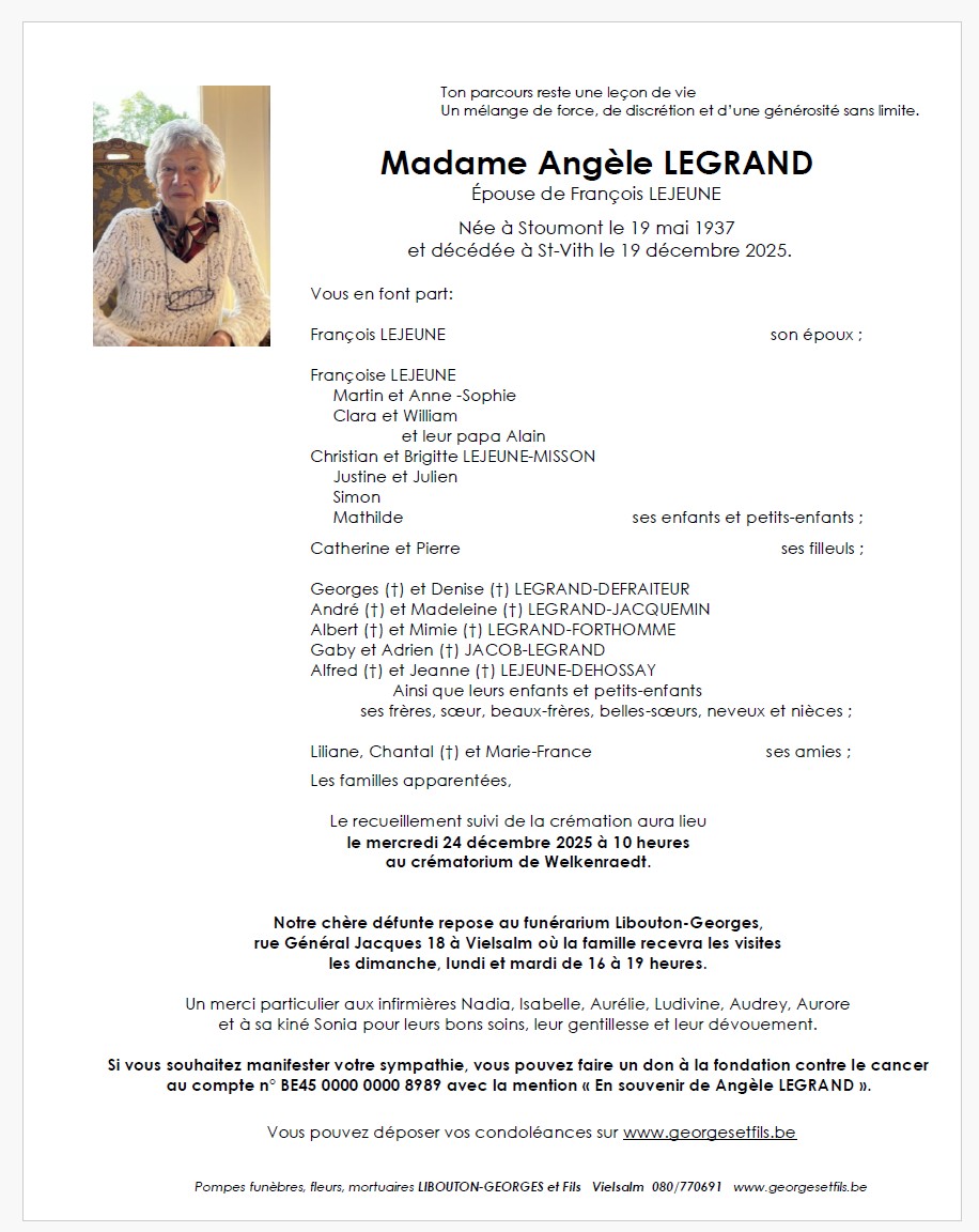 Décédée à Saint-Vith (4780) le vendredi 19 décembre 2025 à l'âge de 88 ans