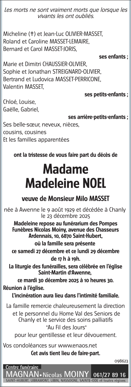 Décédée à Chanly (6921) le mardi 23 décembre 2025 à l'âge de 96 ans