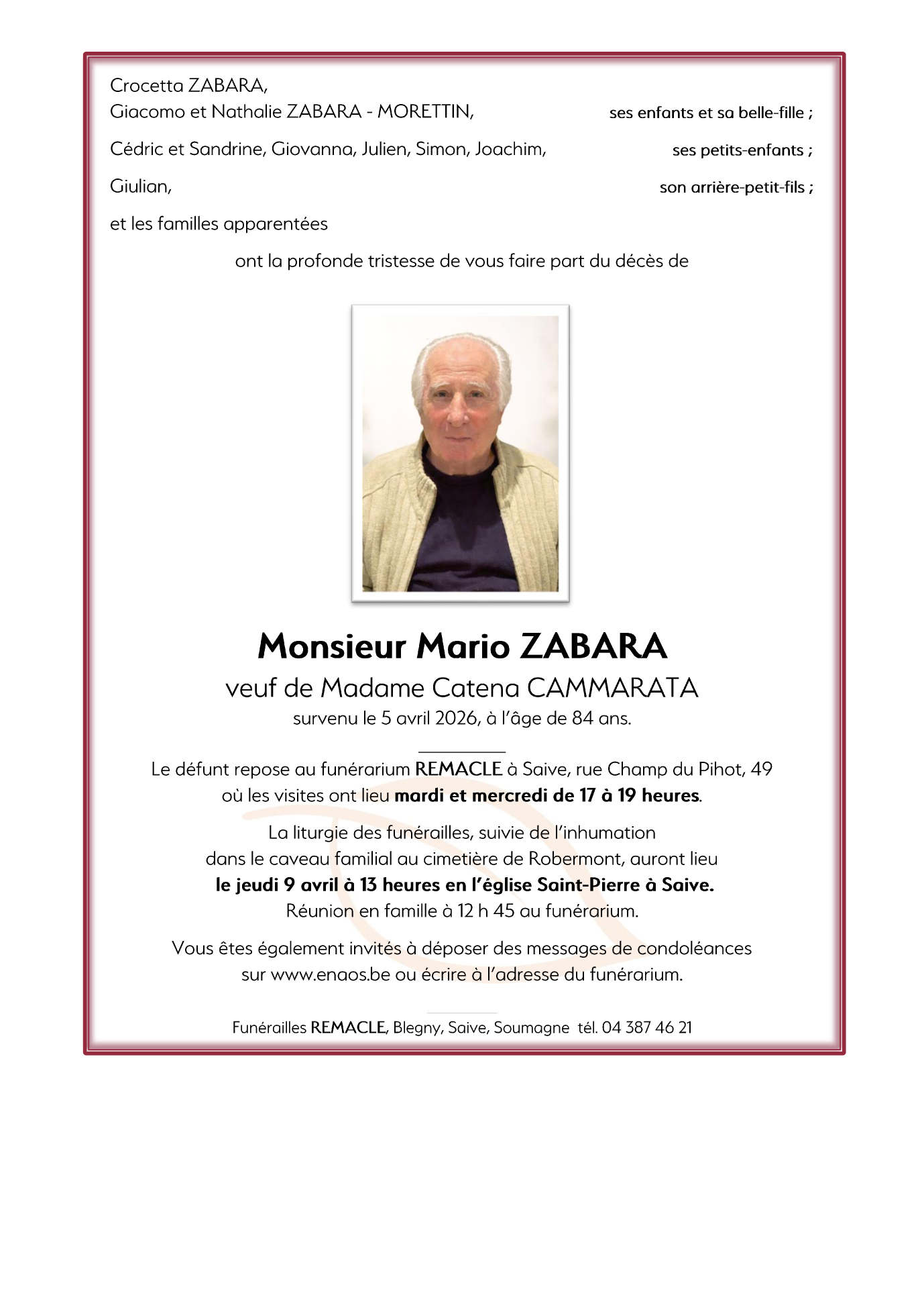 Décédé à Bellaire (4610) le dimanche 5 avril 2026 à l'âge de 84 ans