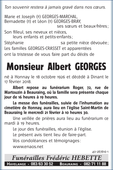 Overleden te Dinant (5500) op zaterdag 17 februari 2018 op 91-jarige leeftijd
