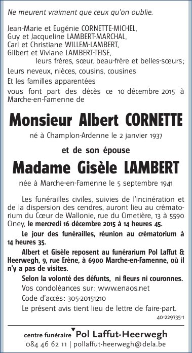 Décédée à Marche-en-Famenne (6900) le jeudi 10 décembre 2015 à l'âge de 74 ans