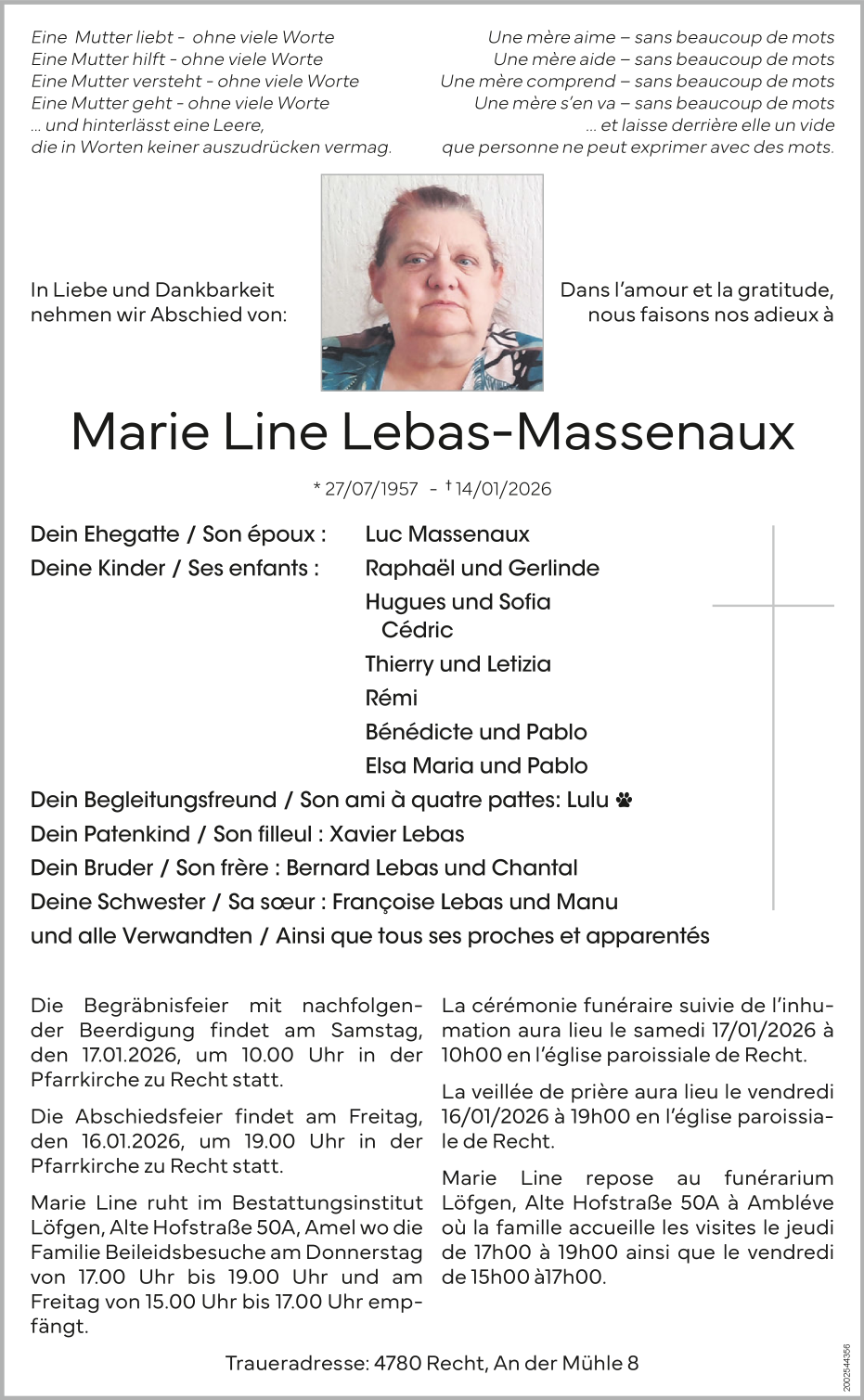 Décédée à Recht (4780) le mercredi 14 janvier 2026 à l'âge de 68 ans