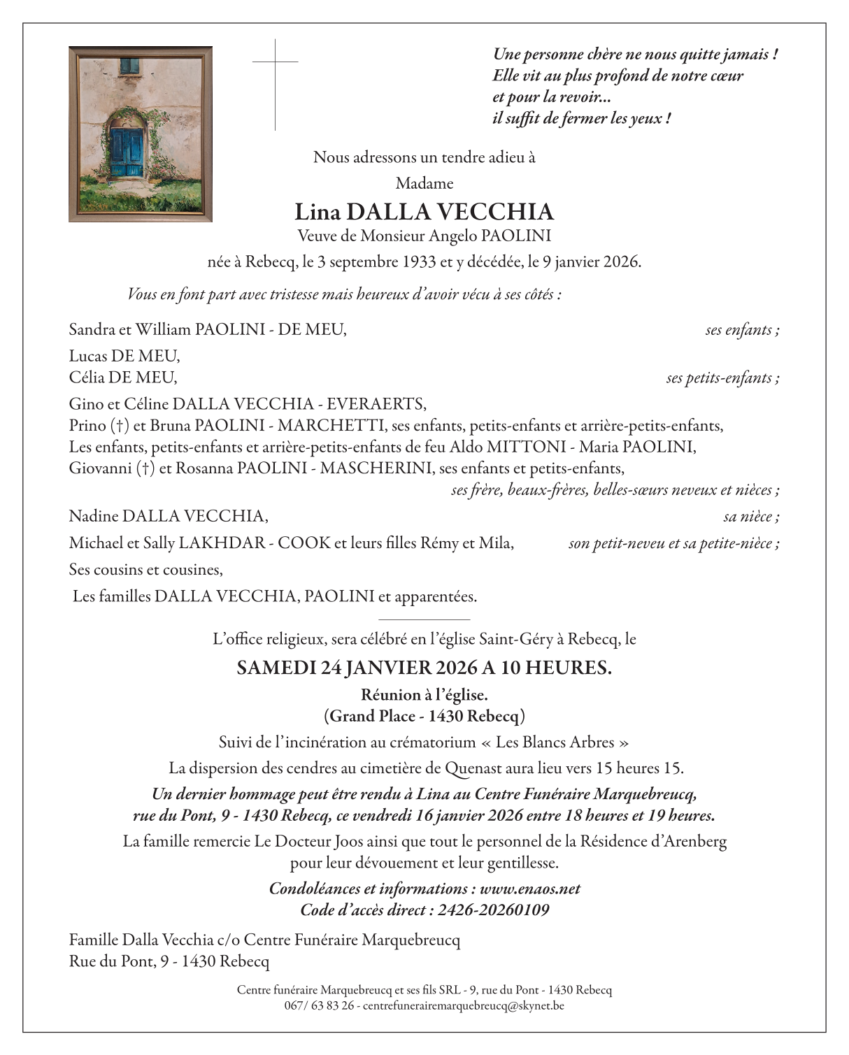 Overleden te Rebecq (1430) op vrijdag 9 januari 2026 op 93-jarige leeftijd
