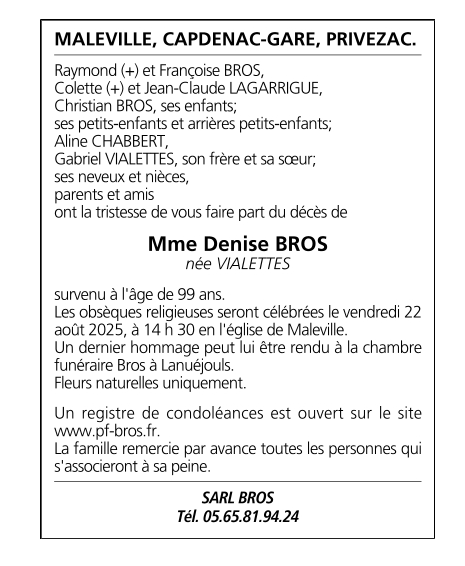 Died in Villefranche-de-Rouergue (12200, France) on 19 August 2025 at the age of 99 years