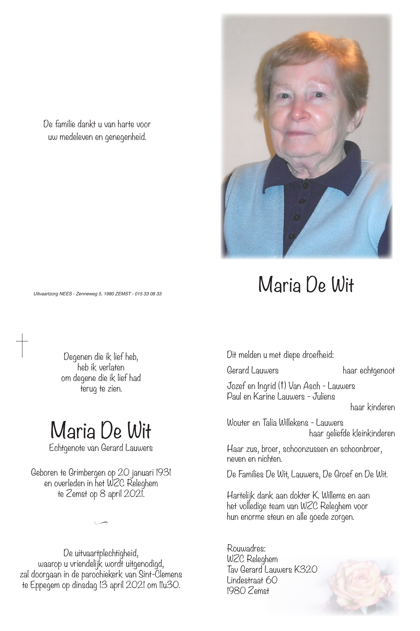 Décédée à Zemst (1980) le jeudi 8 avril 2021 à l'âge de 90 ans