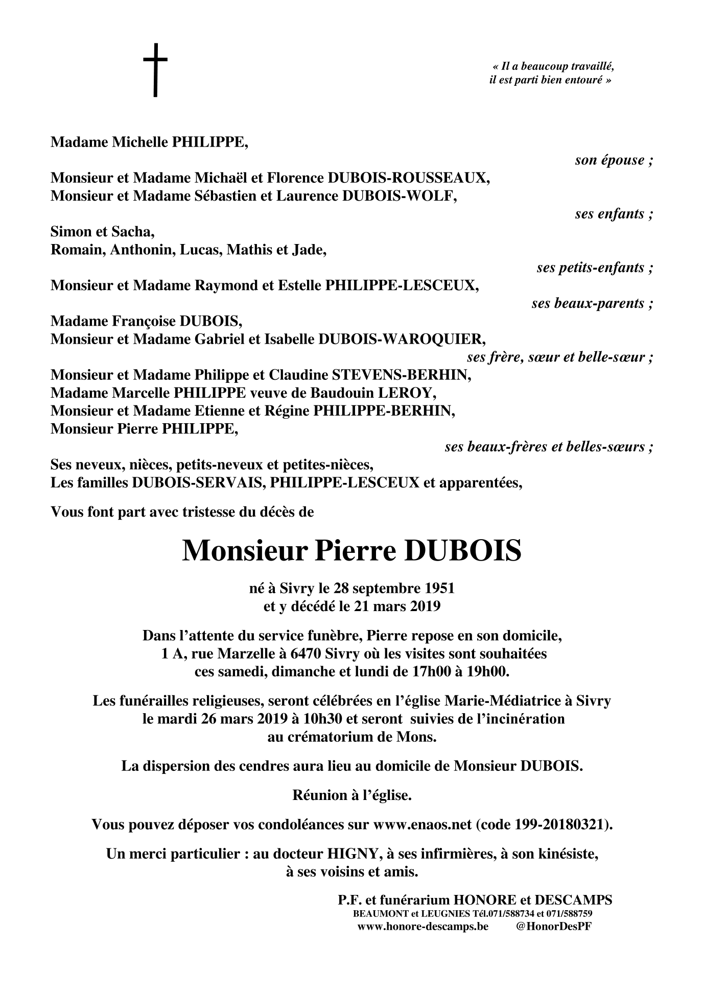 Died in Sivry (6470) on 21 March 2019 at the age of 67 years