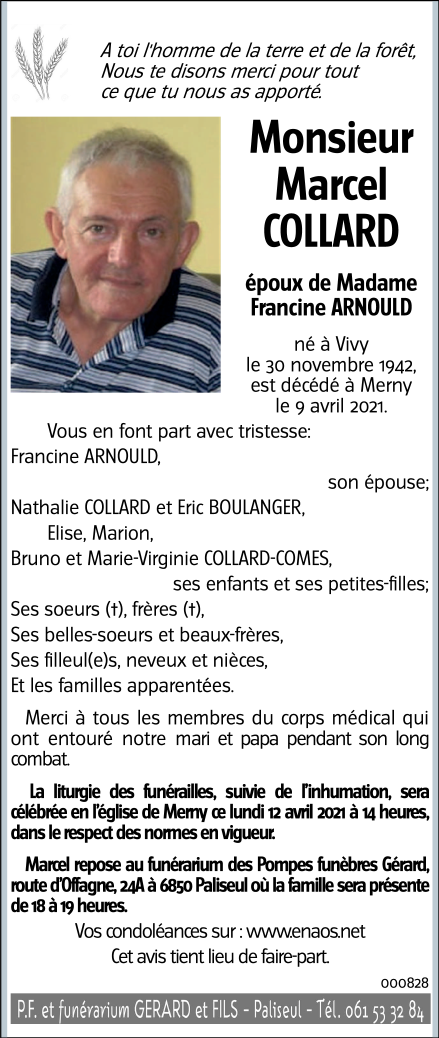 Décédé à Merny (6850) le vendredi 9 avril 2021 à l'âge de 78 ans