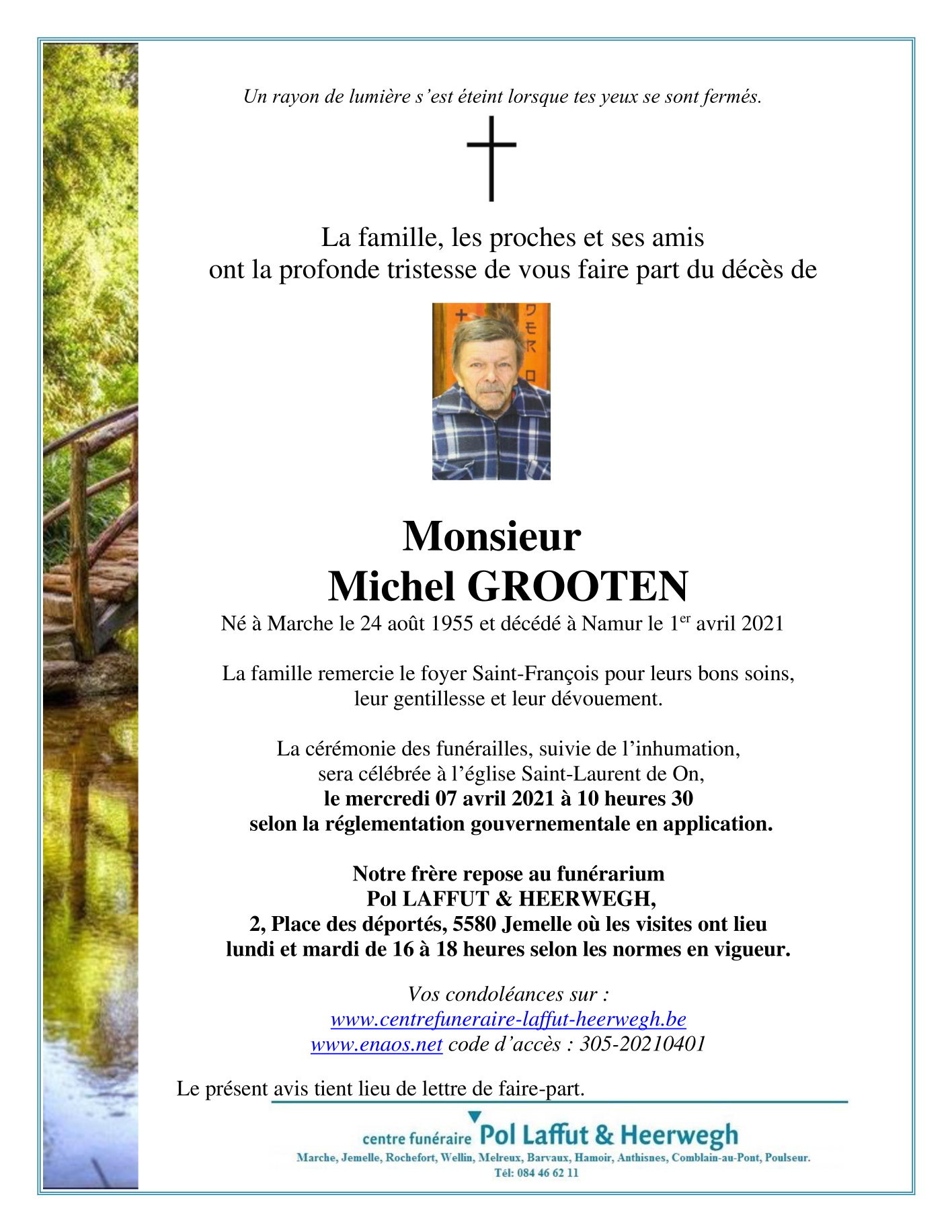 Décédé à Salzinnes (5000) le vendredi 2 avril 2021 à l'âge de 65 ans