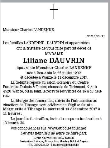 Décédée à Wanze (4520) le lundi 11 décembre 2017 à l'âge de 85 ans