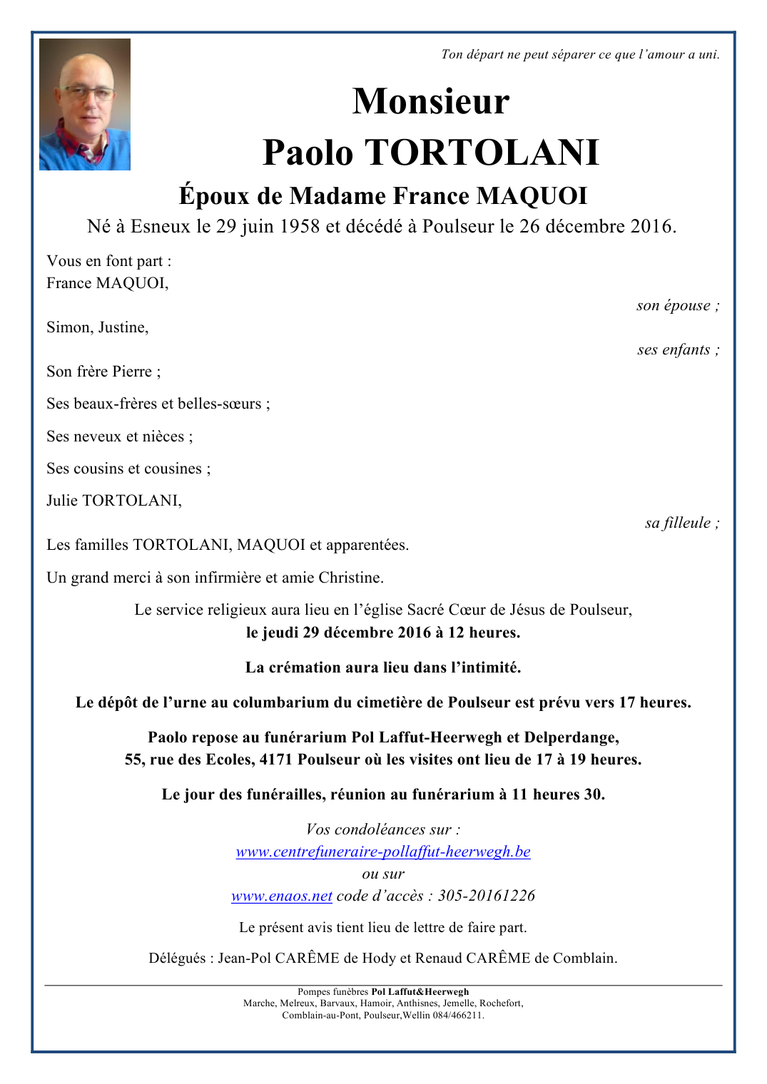 Died in Poulseur (4171) on 26 December 2016 at the age of 58 years