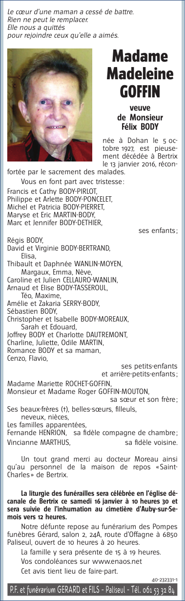 Décédée à Bertrix (6880) le mercredi 13 janvier 2016 à l'âge de 88 ans