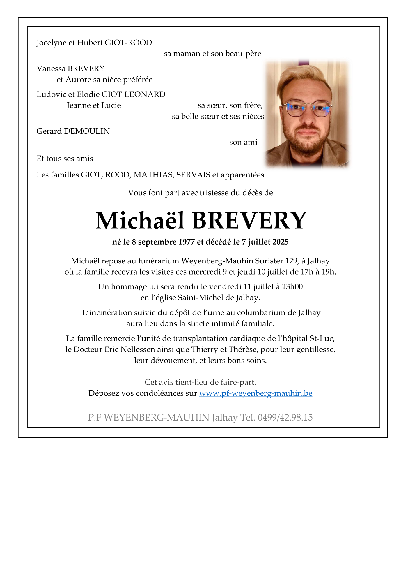 Décédé à Jalhay (4845) le lundi 7 juillet 2025 à l'âge de 47 ans
