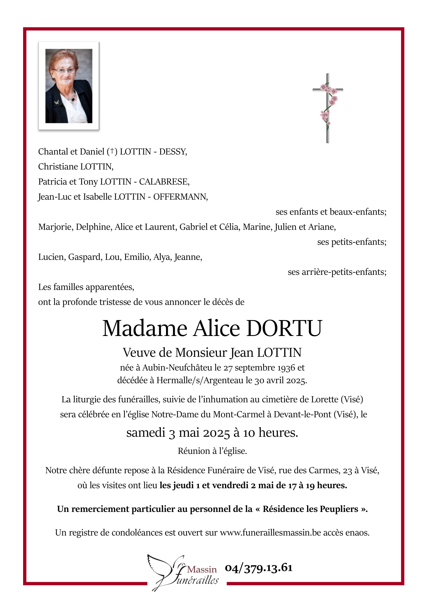 Décédée à Hermalle-sous-Argenteau (4681) le mercredi 30 avril 2025 à l'âge de 88 ans